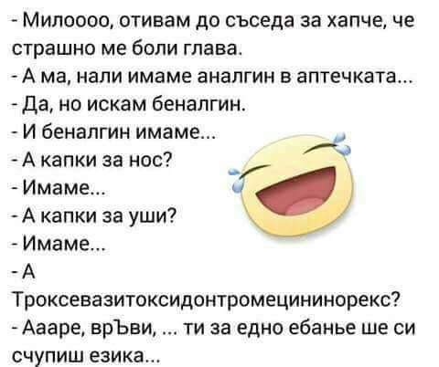 Влюбили се жирафката и заека. Оженили се и заминали на меден месец. Връщат се след месец - заека неузнаваем ,само кожа и кости. Питат го горските обитатели защо е талкова отслабнал. Абе приятели, отговаря Зайо- много секс ,качвам се по шията ,целувам, слизам долу да е.а,после пак целувам..... Как да не отслабна...Минал месец и заека загладил косъма. Кво става Зайо ,свърши ли любовта ви,спря ли секса, та си поналял снагата? Не ,казва Зайо, любовта ни е пак така силна , а секса страстен...Просто вече дето целувам -там е.а, не бягам нагоре , надолу.. icon_idea