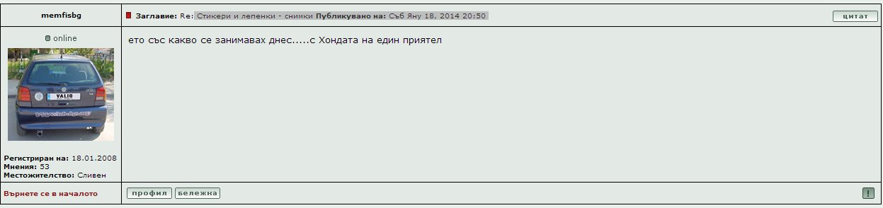 de4o07 написа:Вобще не ми пука дали ще пиша тук. Прсото викам си ще има съмишленици,ще драскаме по нещо ще наичаваме неща за колите си и тва е,направо си трия профила бе маняци аи 4ао.