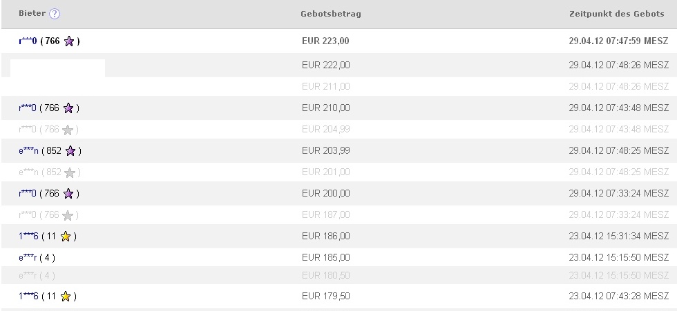 Аз съм участникът с 211,- / 222,-. Как така се получава, че човекът, спечелил аукциона, е наддал преди мен по-голямата сума, и същевременно моят бид е регистриран? Светлосивите бидове са автоматичните бидове, които Йбей прави.