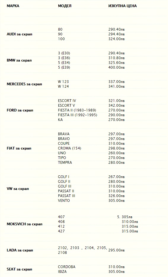 p.s. това са цени от нета, а не нещо, което съм проверил на място или съм попитал, но мисля че са долу горе такива, преди време предадох опел корса 2000 година и ми дадоха 310 лева, всичко е въпрос на попадане на тоичната фирма