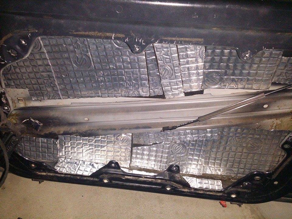 Първо се полага виброизолационен слой, и след това се лепи шумоизолиращия. Тази пирамидалната изолация се лепи върху пластмасовата кора на вратата, като последен слой. Причината е че е мека и се сплесква без да попречи на монтажа на кората, като в същото време не си нарушава шумоизолиращите свойства.