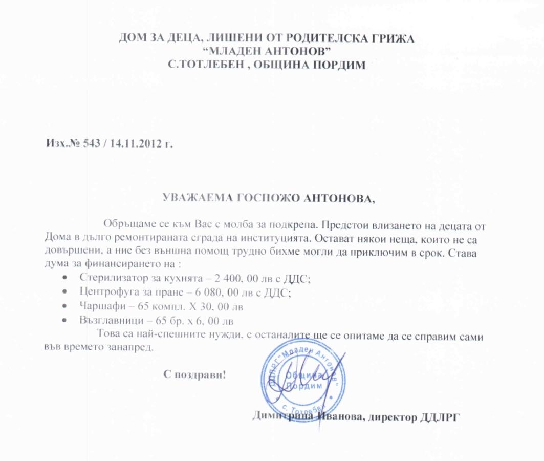 Здравейте.Отново ви пише директорката на дома в с.Згалево.Ако искате по-подробна информация за нуждите на нашия дом ще ви помоля да ни посетите във работно време/от понеделник до петък от 8ч до 17ч/ ,за да проведем разговор, тъй като през почивните дни отсъствам . Предварително ако уговорим среща за почивните дни ще мога да присъствам, тъй като не живея в Згалево.