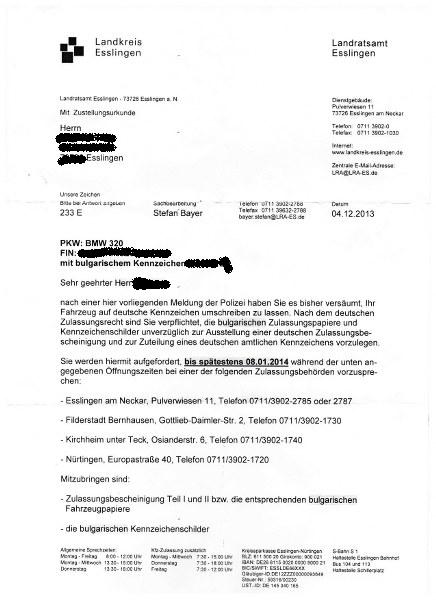 . След седмица получи това писъмце, с което му се разяснява, че най- късно до 8-ми януари е длъжен да смени българската си регистрация с немска, иначе му се пише глоба и спиране от движение. Човекът е в Германия от 2 месеца, преди това е пребивавал 1 година във Финландия, а още по- преди това 2 години пак в Германия. Лош пример...