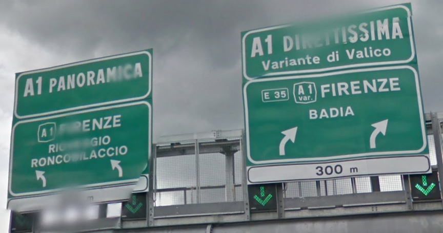Интересното е, че по пътя от Болоня за Флоренция магистралата се раздвоява. Едното е панорамен път (PANORAMICA), който се изкачва високо в планината и има много завои, а другото е директна магистрала през тунели. Ако бързате - изберете директната (DIRETISSIMA).