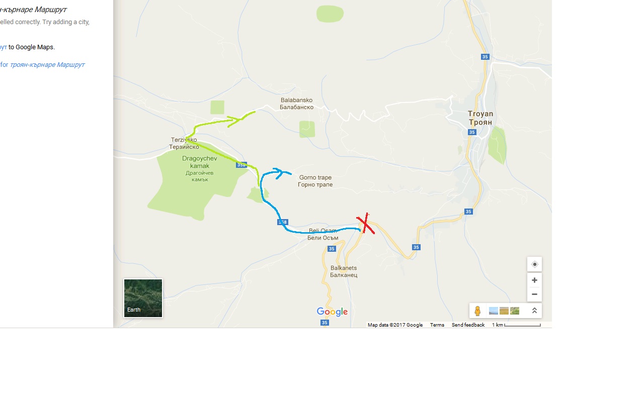 По тази причина не може да се продължи директно към Троян (стответно Ловеч и Плевен), а се минава през (покрай) Бели Осъм в дясно и се гледа внимателно за табелка Горно Трапе.