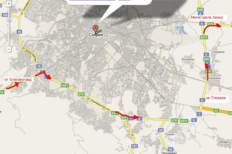 Да , Търси маршрут е опцията , въведи Благоевград - Кнежа в поленцата и ще ти покаже точно пътя през околовръстното на София , после с дабъл клик си приближаваш картата да видиш по-детайлно. С влачене с левия бутон можеш да си я местиш.