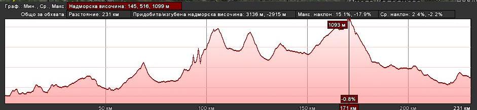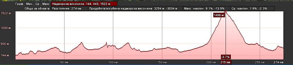 По отношение на височините - максимална 1522 м., средна 443 м., 3254 м. изкачване, 3034 м. спускане.