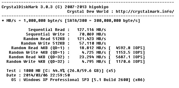 За да не съм голословен - ето ти един пресен скрииншот от подобен на твоя лаптоп, който е с ССД. Както виждаш, ако приемем, че един класически диск от онова време, както е написан в спека, който си пуснал, чете на макс. на спецификацията му, то ССДто е кажи речи 30 % по-бързо, просто защото самото ССД е по-бързо от интерфейса на дъното, който от своя страна е по-бърз от хард на 100 МБ/с