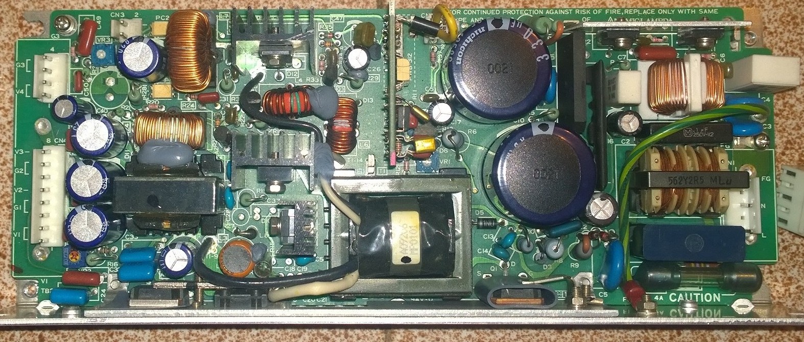 Трансформатора, греца и този големия кондензатор са от една захранваща схема. А импулсното си е друга захранваща схема. То се вижда, на единия край има куплунг за мрежово захранване, фаза L, нула N, и заземителен извод FG. На другия край са изходящите два куплунга с изводите и напреженията посочени на металната кутия. Разбира се, при работа с това импулсно, отворено така, трябва да се внимава много, поради сериозната опасност от токов удар...