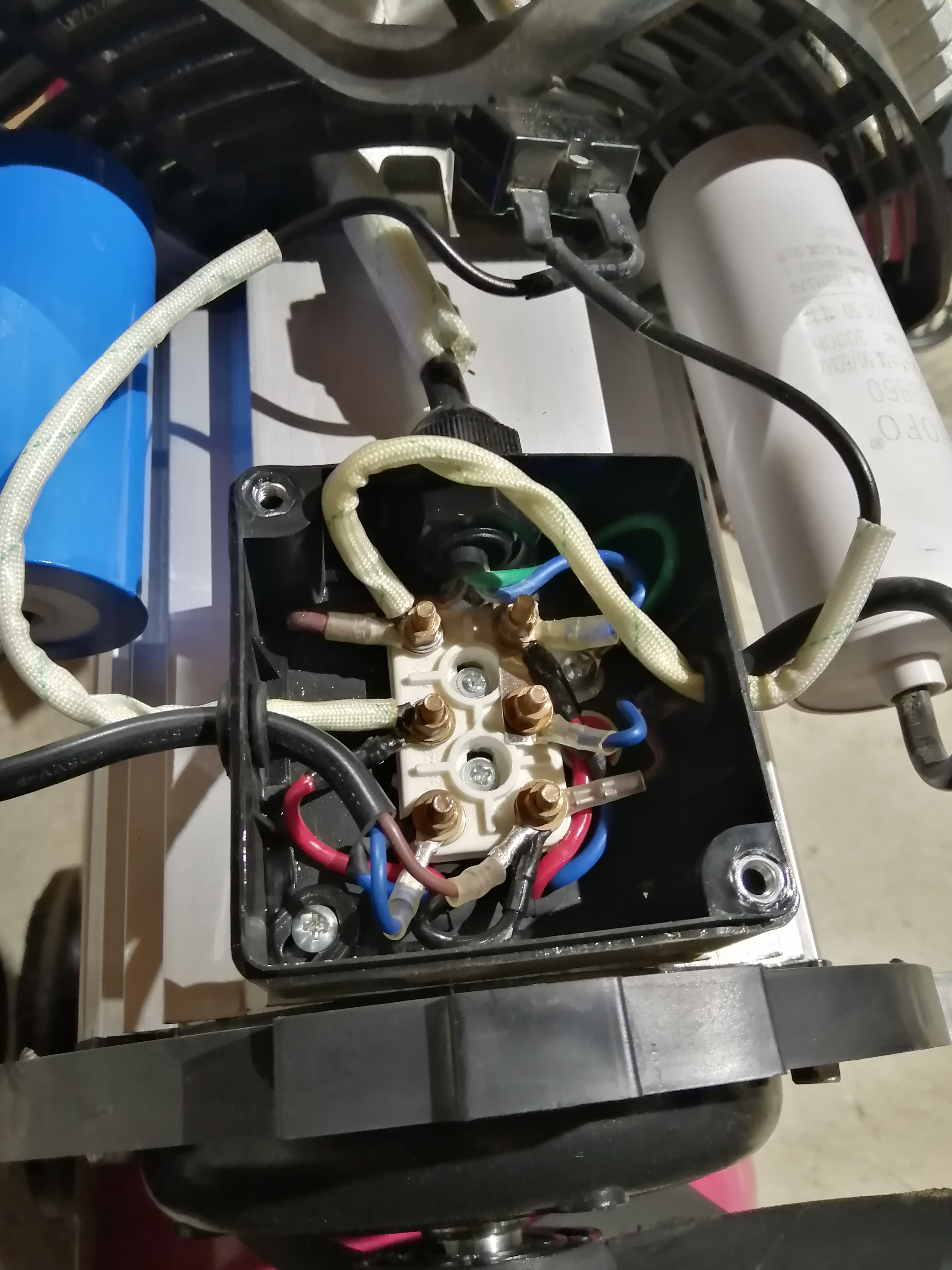 Дам ти си по зле от мен, компресора ти има пусков и работен кондензатор, а това значи че двигателят има центробежен изключвател. И съответно от слабото напрежение не може да дигне обороти и да изключи пусковата намотка. Товари се двигателят и пада бушоня. Ориентирай се към трифазен компресор. При мен е само работен кондер, ако не се оправи с по големия кондер ще се ориентирам и аз към трифазен компресор, имам трифазен ток и с две други машини с трифазни двигатели(абрихт и банциг) засега проблеми няма.