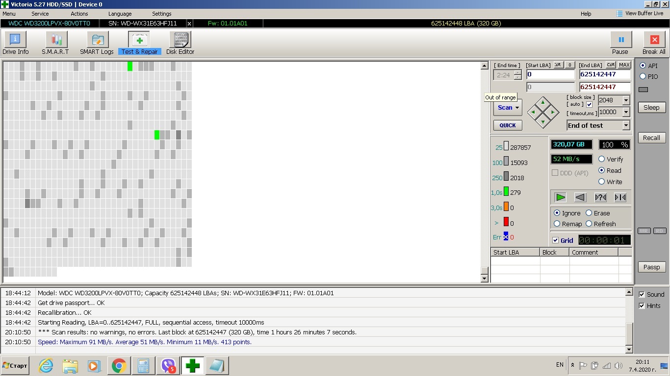Зелените сектори - не е добре. Когато тече теста, цъкни върху Grid за да може да видиш скоростта на предаване на данни.