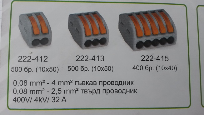 Клемите на Ваго тип 222 са до 32 ампера независимо от сечението или типа на проводника.