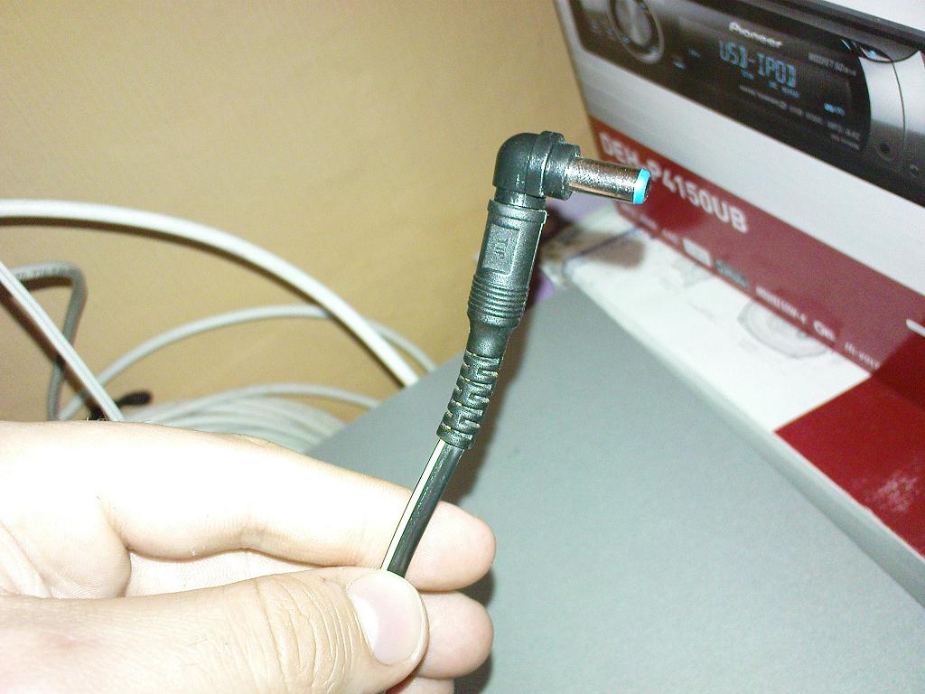 моята теория е че според чертежчето което е на самия адаптер черната жица с бяла лента трябва да е + която