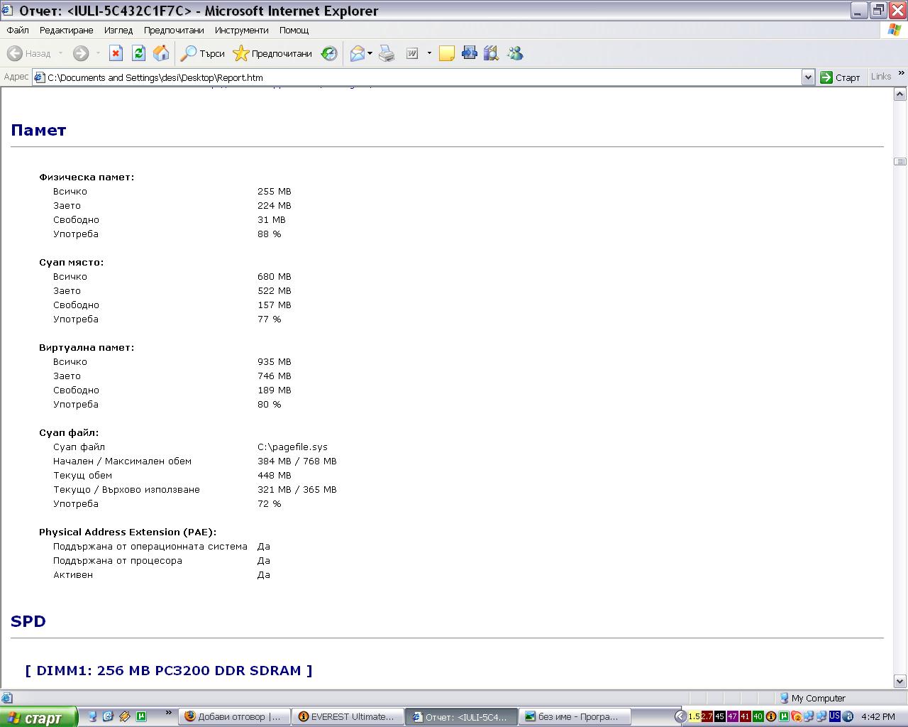 Значи на снимката дето е постнал колегата пише 256МВ RAM дори и за ХР е твърде малко, поне 512 въпреки че върви и с 256. Въпроса е както каза колегата отгоре, да сложиш еверест и да видиш от общата информация какъв вид памет носи твоето дъно SDRAM или DDR, защото едва ли е DDR2.