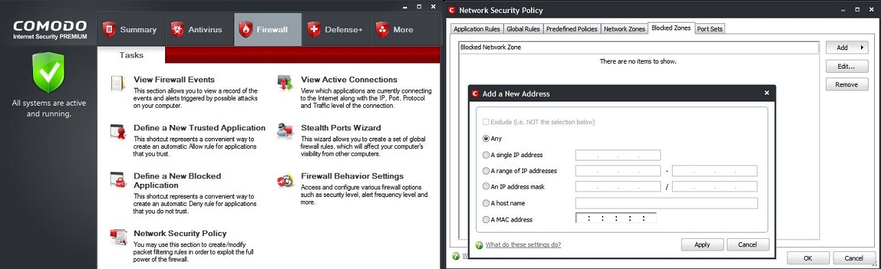 Колега, аз ползвам ето това http://personalfirewall.comodo.com/ свободния му вариант, даже. Има купища настройки плюс Paranoid Mode. Най-ценното нещо на това Comodo e стената. Добавяш/махаш зони, правила и адреси както ти скимне. Богато е откъм настройки, ето ти примерен скрийн за пълен блок на дадено IP. И пълен твой контрол върху портовете ти, в добавка.