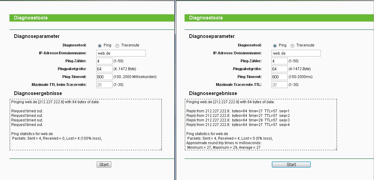 От ПЦто, закачено по кабел към LAN-1 пинга към интернет също е ок (Уиндовс ПЦ). Обаче от друго устройство, висящо на същия рутер по кабел, пинга не функционира. Двата рутера са с идентични настройки.