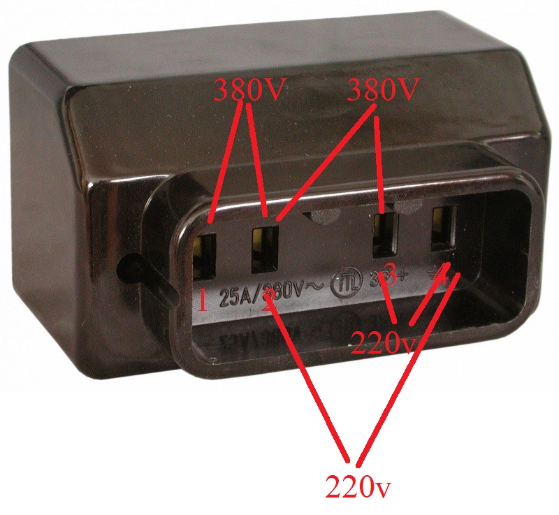 1,2,3--фази.4-нула.За нулата трябва да има и символ на кутията на контакта.