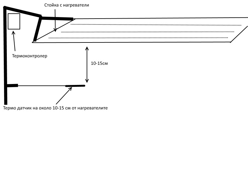 В първия ми пост съм дал примерна схема на това което трябва да се получи или иначе казано нагреватели под тях на около 10-15см датчик за температура и контролер. Но явно има още неща като контактор, активен превключвател и т.н. все непознати за мен неща.