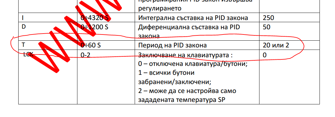 , защото в описанието на регулатора , което е дадено в сайта е много постно, но при всички случаи не видях параметър хистерезис. Това е PID регулатор и е логично да работи проблизително както съм се опитал да обясня. Между другото една от настройките описана в PDF-а би трябвало да е периода на тази последователност ON/OFF :