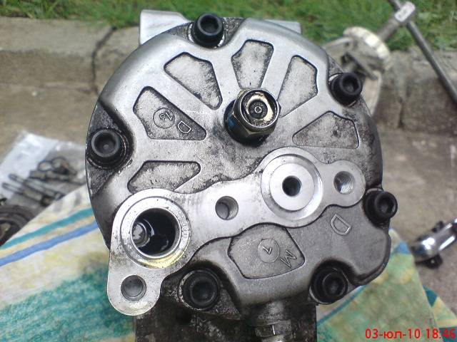 3. авариен клапан,който изпуска фреон в атмосферата - сработва между 35 и 40 бара,като това е крайния вариант,понеже не е особено екологичен,както се сещате. Точно това е клапана,който е отзад на компресора.Повечето компресори,които VW монтират,го имат. Обикновено обаче компресора става на салаа доста преди да сработи някоя от горе изброените защити,понеже с времето се получават луфтове по буталната група и като го натовари налягането и нещо се откъсва,от там ефекта е тотална салата на бутала,клапани и т.н. и често завършва и с дупка в корпуса.