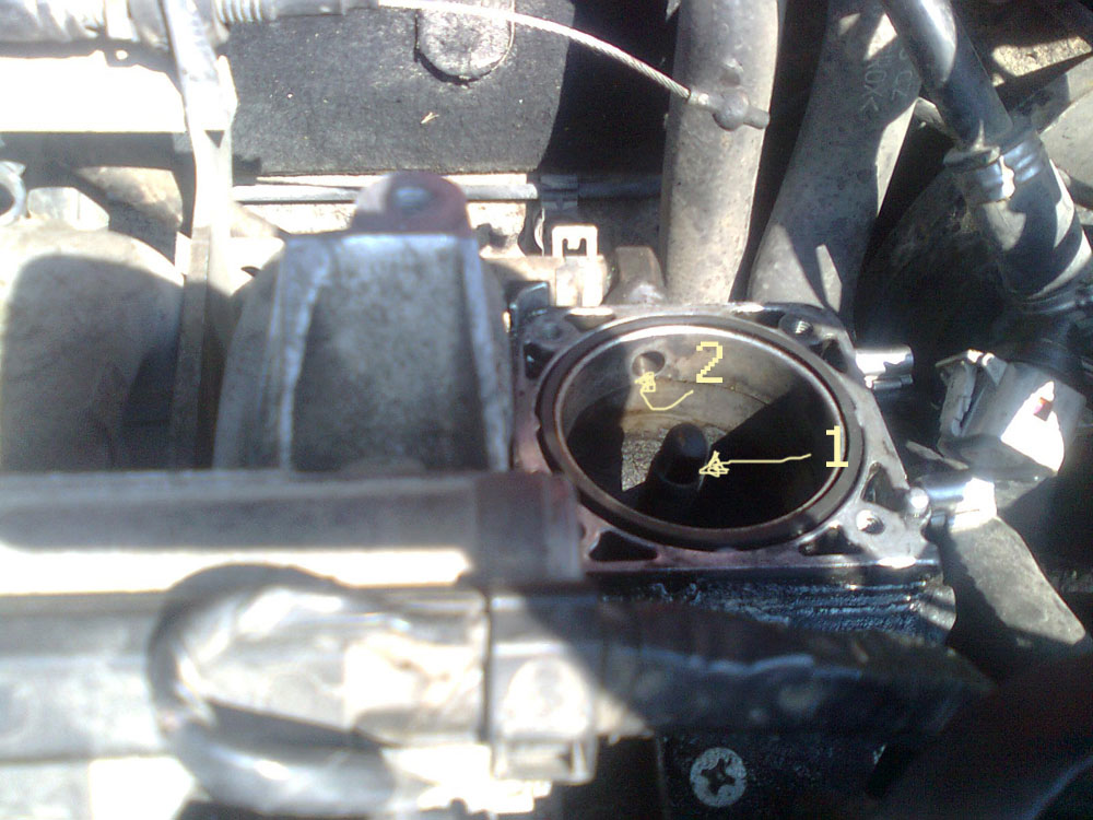 Та така.... Почистих дросела и всмукателният колектор под дроселовата клапа - където се намира - и на снимките от местата 1 и 2 изкарах толкова много нагар, че чак като го изчистих и ми дойде надеждата, че ще успея да я подкарам да върви. На мястото означено с 1 ( не го знам как се казва ) имаше дупчица колкото глава на топлиика а каато го почистих си стана доволна дупка с размера колкото на нокътя ми на малкият пръст, много нагар имаше, а на мястото 2 успях да ррекарам и едно кабеляе хубаво да го прочистя и почнах да зглабям със затаен дъх, бях сложил клемите на акумулатора допрени, че някъде четох, че това чистело грешките по компа. и като запалих после