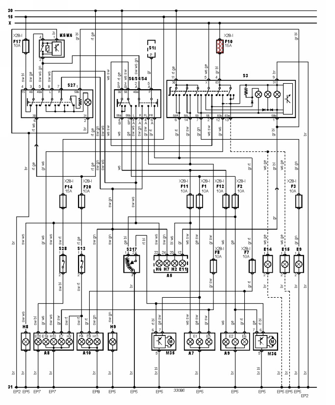Не знам. Трябва да се премерят и проследят не ми се е налагало да го ремонтирам. Не би трябвало да са толкова много. Два би трябвало да отиват към горния ключ-за къси и дълги. Още 4-ри на самия двупозиционен ключ. Какво точно не ти работи??