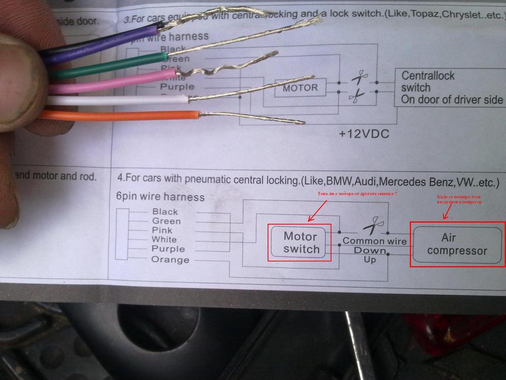Не бърничкаи по кабелите от зад кво ша сложиш оправлението в багажника и ще му дърпаш + ли .Пипаи кабелите които излизат от шофиорската врата ( погледни ги кои цветове отиват на бравата)и управляват компресора долу в краката в ляво до бушоните излизат.Мериш на кои има + и с една карфица от него боцкаш един по един.Ще оцелиш кои отключа и кои заключа.