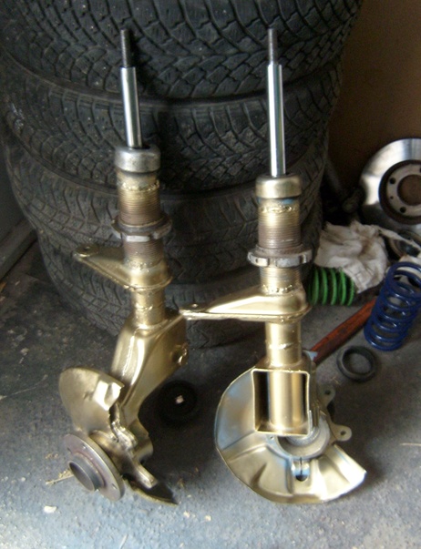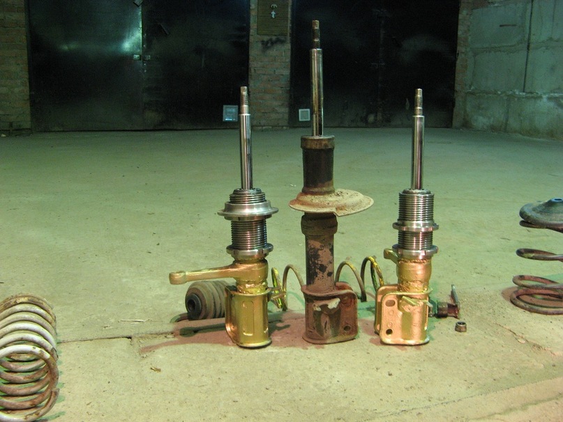 Проблемът, е че колата е доста смъкната и с старите амортисьори тампона се смачква и удря на купе. Опитвам се да намеря твърди двоинодеистващи амортисьори, които да са по къси от старите за да мога да намаля самия макферсон на височина. Нещо като това от снимката по долу. Прилагам и снимката на моя макферсон, който е с нормална дължина. Помогнете ми, ако имате идея какви или от какво да взема амортисьори за да си карам количката