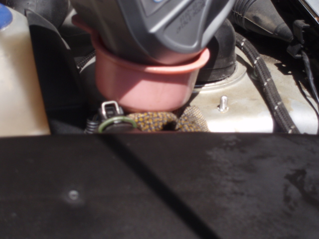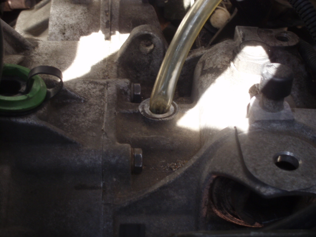 Понеже не бях сигурен,че трябва да налея 2 л. масло,аз отвъртях контролната пробка и докато наливах,поглеждах кога ще просълзи от там.После пак с тефлонче си я стегнах,сложих корите ии...пей сърце