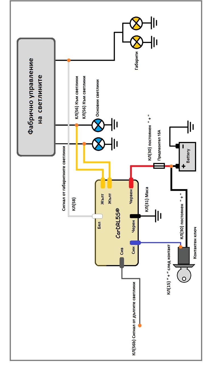 Та въпроса ми е къде точно да вържа 2 та кабела от drl а които подават + на късите ( мисля че те подават от 12 до по малко волта в зависимост от това на какъв процент да светят късите) и затова е упоменато категорично да се вържат след реле ако има такова. Идеята ми е да не водя дълги жици до отпред а да ги вържа в купето , но от ключа за фаровете само по един кабел подава 12 v на късите , питането ми е този кабел( жълт) от ключа през предпазител ли минава и направо на фаровете или отива на реле и от там на фаровете. ?