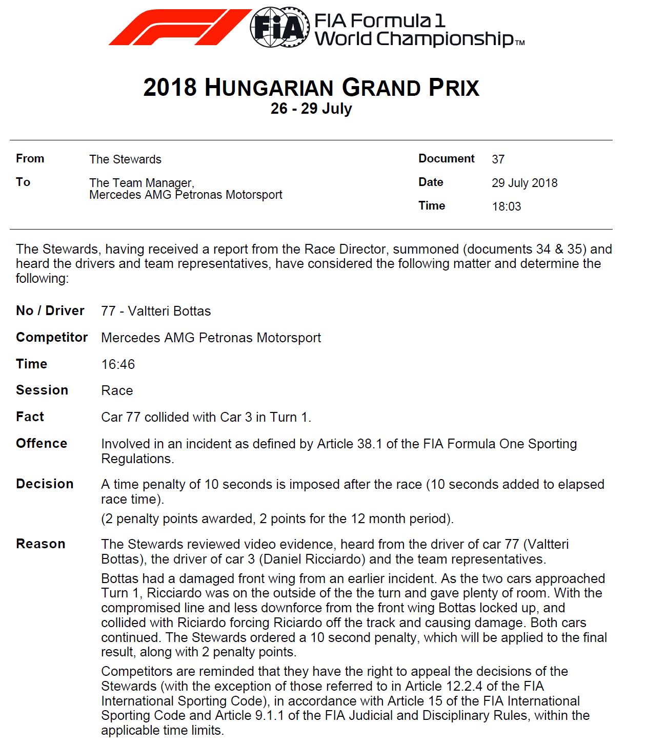 - стюардите не мерят с еднакъв "аршин" - ситуацията с бокса на Хамилтън в Германия и карането на Ботас в Унгария (за първото съприкосновение с Фетел няма наказания, за второто (с Рикардо) все още няма становище). Само ще припомня наказанията към Райконен за сравними провинения.