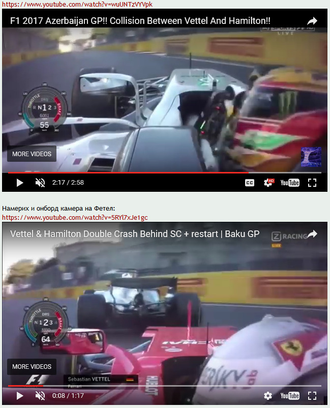 На мен ми стори, че Фетел си вдигна и двете ръце от волана, последва по-скоро случаен удар. Поне гледайки лявата гума на Фетел не виждам движение надясно, а наляво след удара. Но може и да бъркам. А Хамилтън не ми е любимец щото е мрънкалник, или му пречи някой, или друг му с..л в гащите. За негово съжаление няма как да кара сам на пистата.