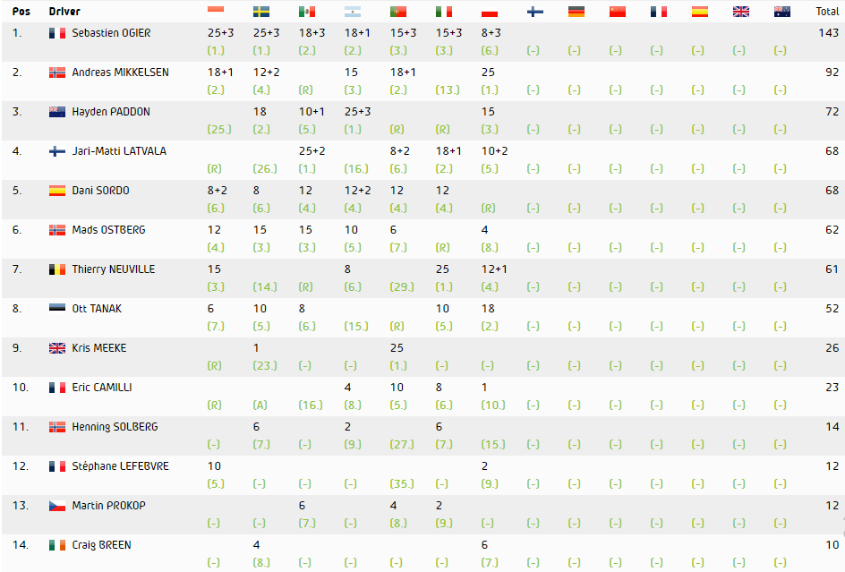 Ето графика с оставащите стартове и временното класиране най-вдясно. Определено след Ожие изглежда оспорвано и въпреки vw с който кара, съм една идея против него с цел интрига, че е недостижим.