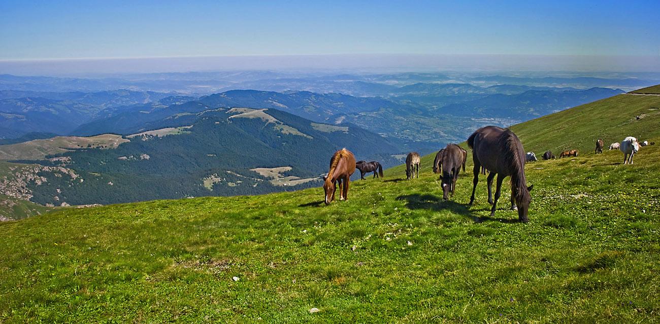 Стадо коне в подножието на в.Ботев, на почти 2300м. надморска височина, ненормално ясно време с ненормално синьо небе, видно от самата снимка