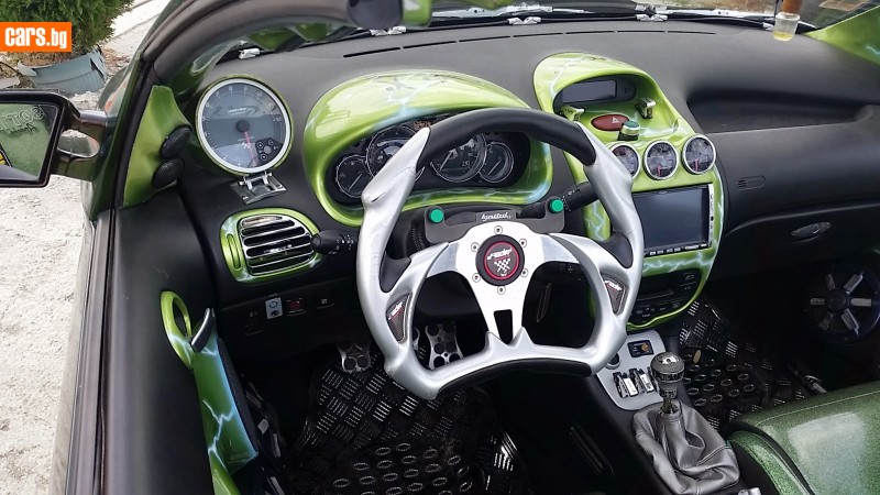 Интериорът - бяла кожа, която струва доста пари. Друго не се вижда, но според мен колата има доста завършен вид и в никаъв случай не е "селски" тунингована.