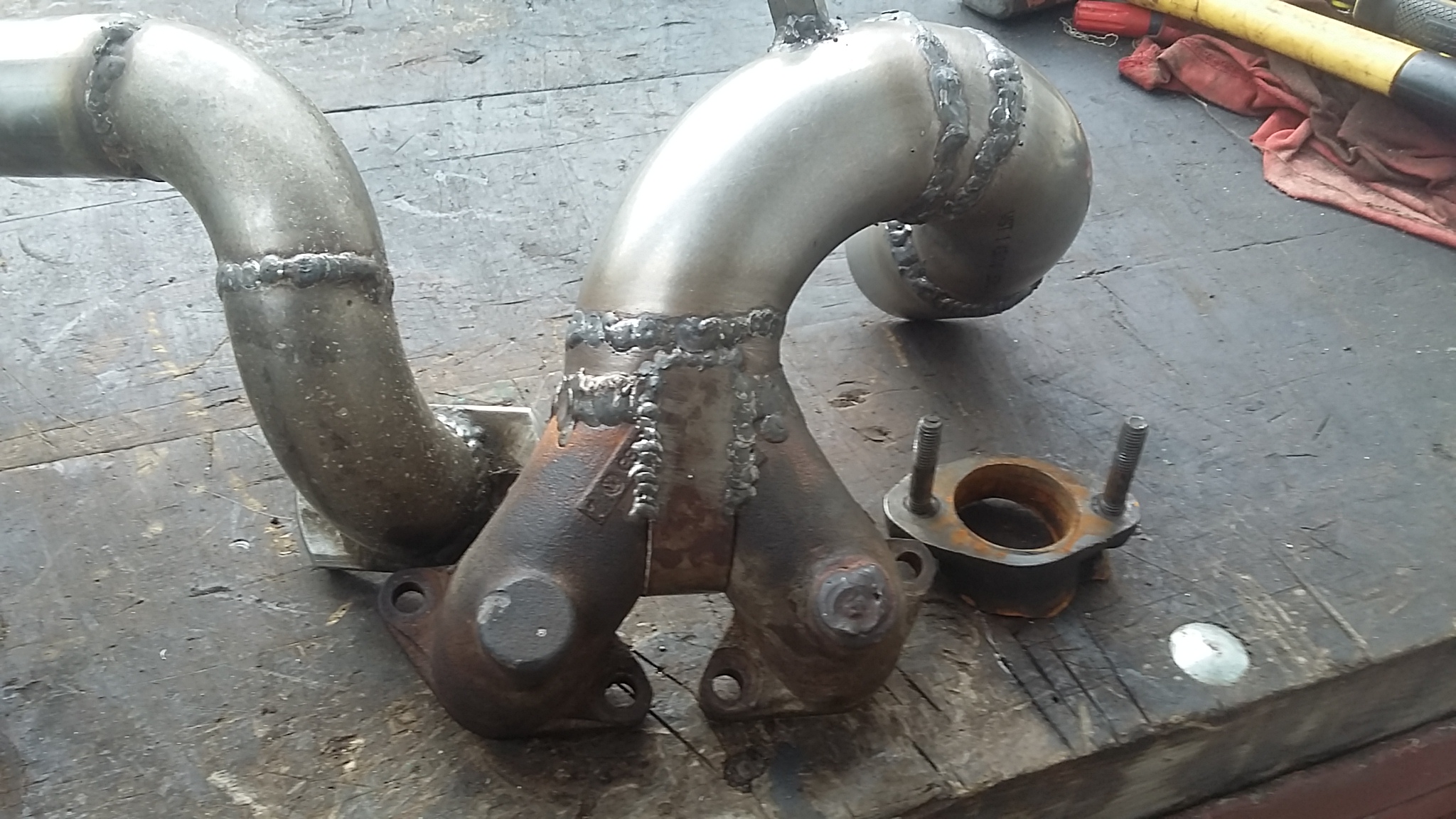 И смукателите преработих пак по най-просташкия начин за да вкараме максимум въздух...на снимката е старата тръба 40мм по която идваше въздух а сега с изрязани колектори и заварена тръба на 55мм.Проблема е че колектора е чугун и дано не спука заварката :stumm