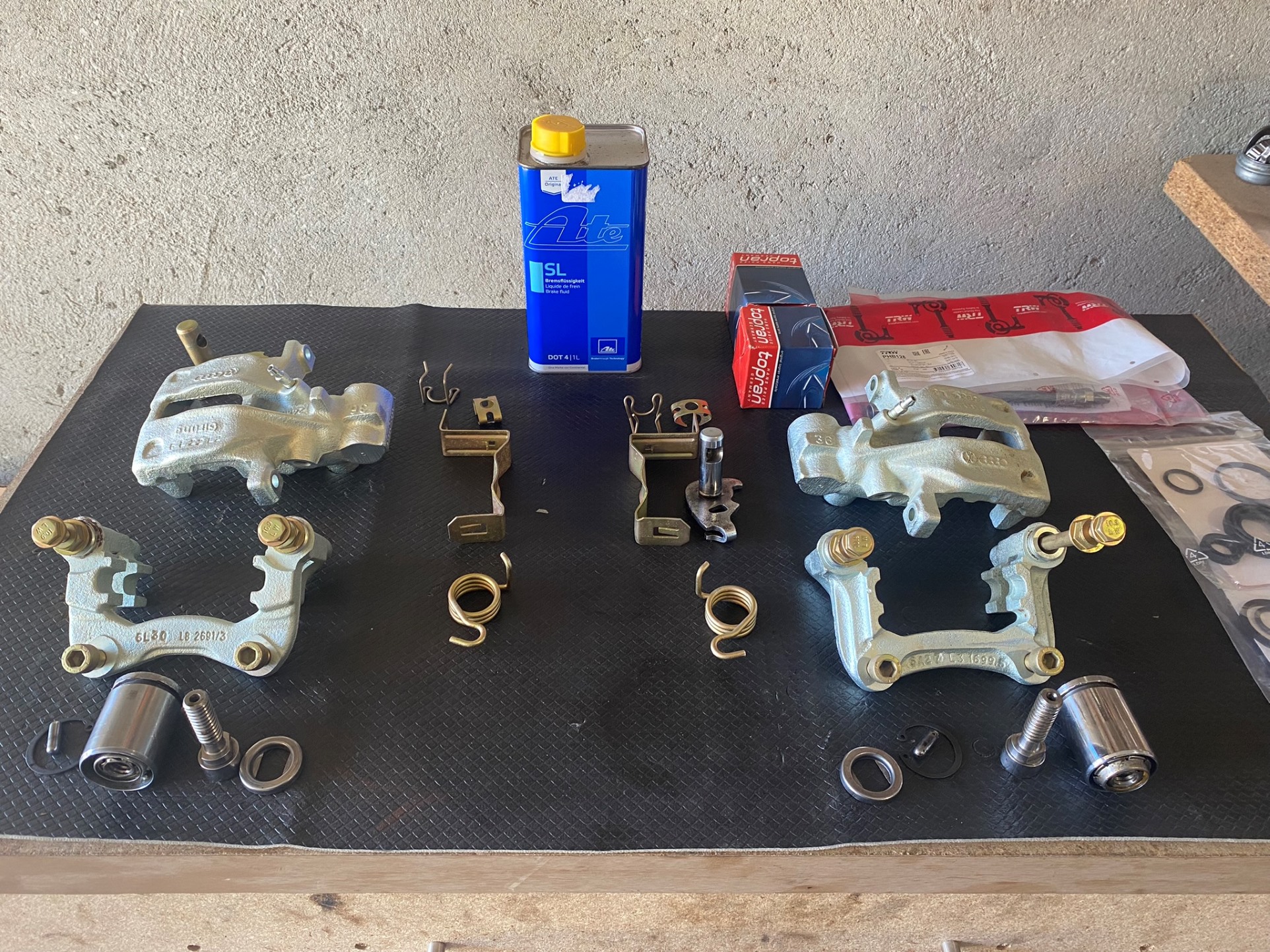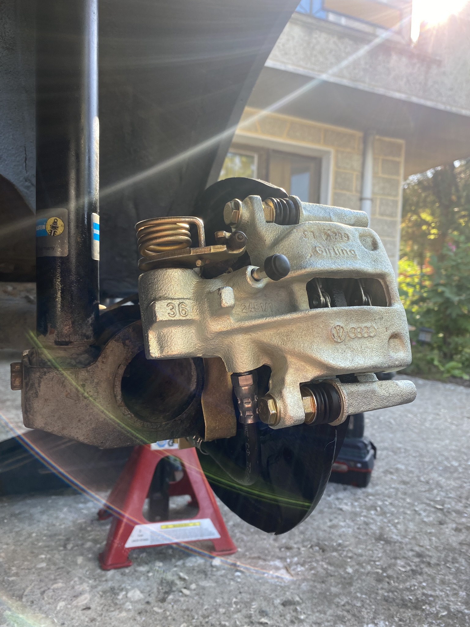 В сравнение с предните спирачки, задните изглеждаха доста неугледно. Бях пратил предпазните ламарини на прахово, така че сега беше момента и за апаратите.