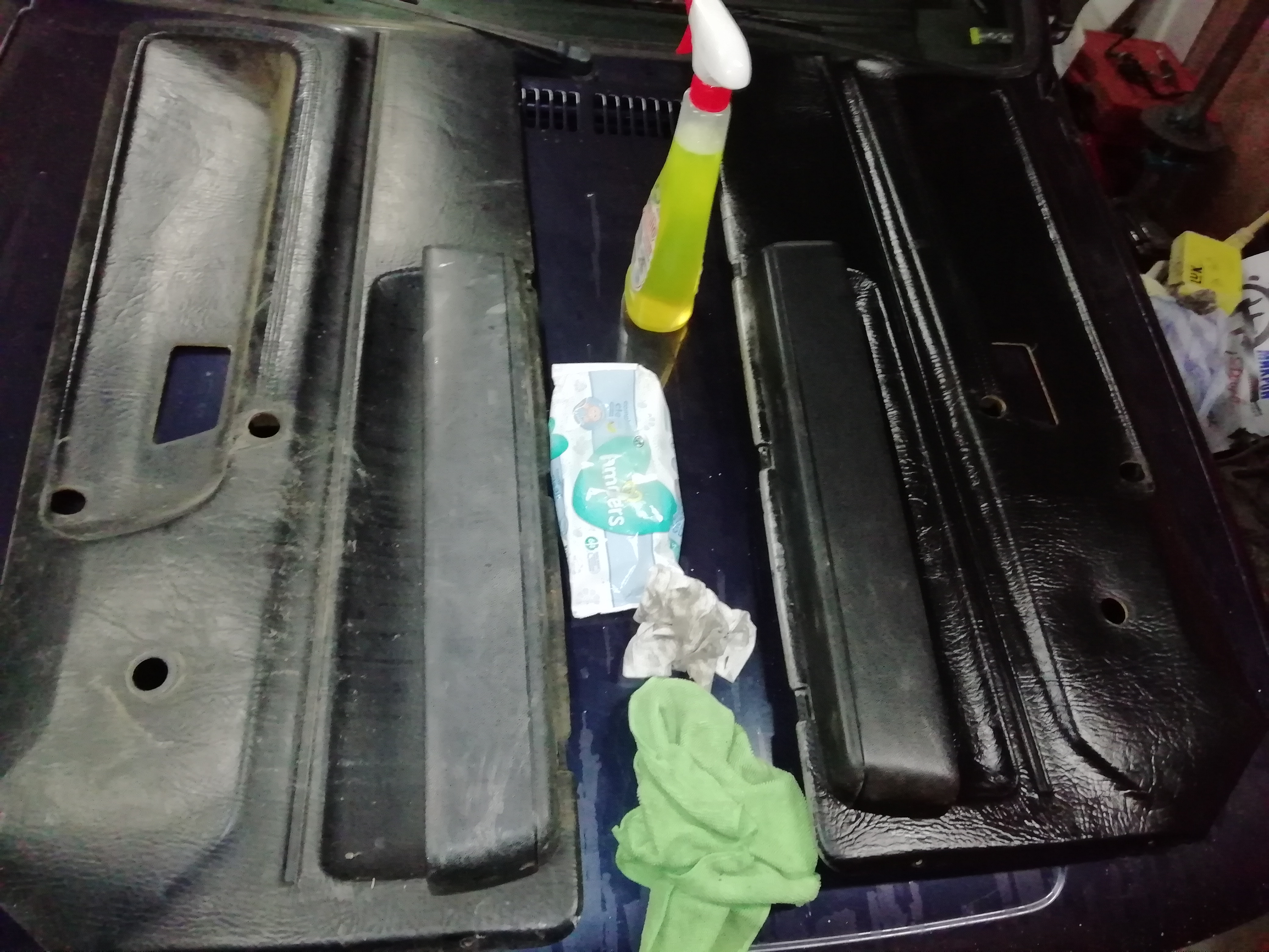 И понеже съм роден с късмет, оказа се че моите триъгълни стъкла са с около 15-20мм по-големи от тригълните стъкла ползвани в дебелите уплътнения на 86с - съответно не можех да ги ползвам. А се налага да ги ползвам защото откъм интериора моите стърчат над метала. Прибягнах до софийския донор, който се оказа със сиви и в лоши състояние кори на вратите. Късмета ми пак "работеше" с пълна сила - колата е с две различни стъкла, едно малко откъм шофьора с дебело уплътнение и едно голямо откъм пасажера с тънко уплътнение макар и за къса вътрешна кора. Въпреки това ги взех, съответно сглобих с тях - ето ги едно до друго да се видят разликите:
