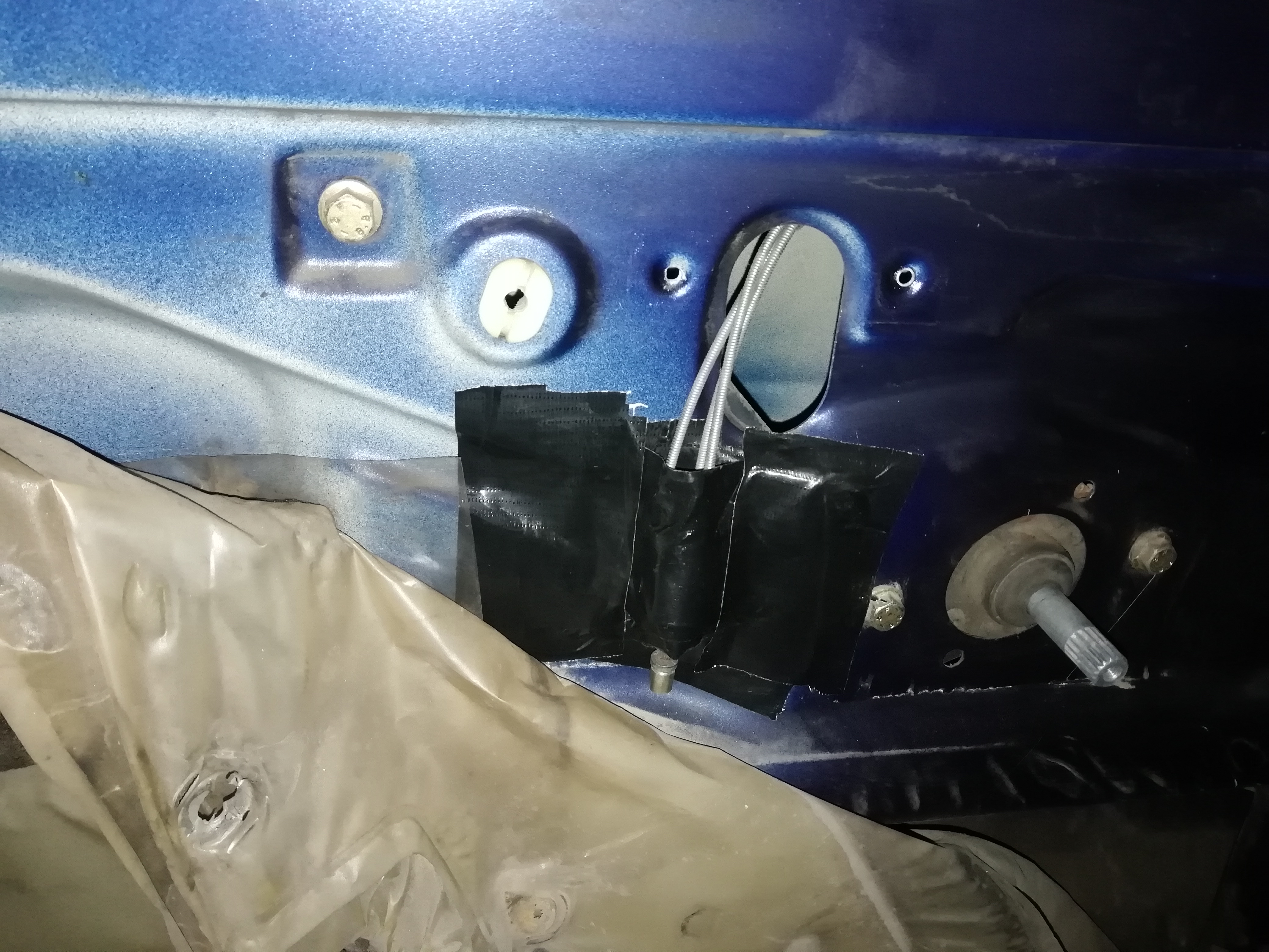 Докато махах старите кори попаднах на един пускан допълнително кабел, който седеше бая опънат в левия калник зад кората - оказа се че е за някакво правено ключе следящо кога е отворен багажника. И без това не съм го виждал да работи - рязко напусна обекта с все кабела