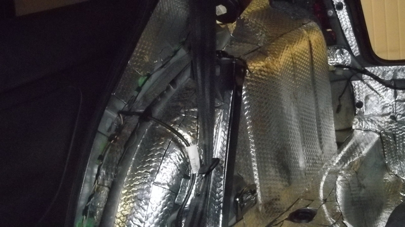 По самата кора на вратата(сухата част) също е налепен K-flex. Реших, че колони в задните врати няма да ми трябват и заради това зашуших дупките за говорителите с изолация, за да не влиза излишен шум при движение от там