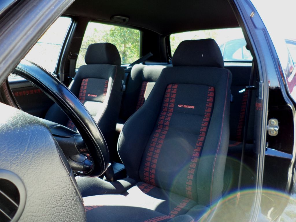Ето и една снимка на интериора..Имам още малко работа по него като например да си намеря читава топка за лоста + волана с червен шев,че на моите им е протрита кожата,а пък не искам тапицери и т.н. Едни джобове на вратите със мокетче и плафони които обаче никой не продава отделно а ми предлагат целия тапет..И най-трудното нещо за намиране-червени колани от юбилейните ГТИ-та с карираното плитко рекаро.
