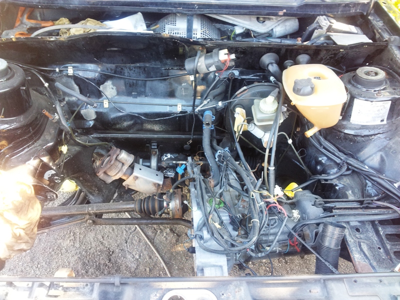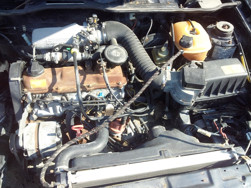 След като бях готов с ходовата част реших да мина към двигателя.Поради причината ,че колата не бе мърдана от мястото си поне 3 г. от стария собственик реших да ползвам една външна бензинова помпа /понеже мойте са спекали/ и да пробвам дали би запалила.Вързах я директно към рейката и подавах напрежение от др. акумулатор и след като нагнети малко я изключвахме.За радост и учудване запали много лесно ,обаче...винаги има обаче,колата започна да работи само на 3 цилиндъра като гледах кабелите и свещите бяха дори и ме наведи мисълта ,че имам подпушена дюза /не съм ги водил още на ултразвук/ и тогава дойде проблема......разшерителния съд се напълни с масалце.Реших ,че е издухала гарнитура и си викам "кога ще е гарга нека да е рошава" и започнах да разглобявам двигателя за пълна профилактика.Оказа се обаче ,че проблема е мнооого по дребен....масления охладител на масления филтър да вземе да се спука и оттам всичко това.....В момента двигателя е разглобен ще бъдат сменени биелни лагери,всички гарнитури,семеринги и главата заминава за Сливен,блока е боядисан черен....чудя се само как да освежа окислените алуминиеви части..алтернато,стартер...