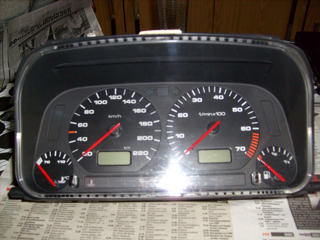 За километража съм го направил със светодиодна лента и съм запоил + и – съответно със кабелчета.Както се вижда по-долу на снимката,червения кабел е + а черния е – На дисплеите на часовника и на километрите съм сложил пак диоди но със цокъл,на мястото на обикновената крушка.Там също съм запоил диода,като съответно на всеки диод съм сложил резистор.Имам и снимка на диодите които съм използвал съответно със резистори.Така съм си направил и всички копчета,кадето е имало обикновена крушка съм сложил диод.Остана ми да направя само на парното и там да ми свети,ще кача снимки като стане готово.Само трябва малко да го преправя и да сложа още диоди че ми се види малко слабичко.Общо зето е това колега.