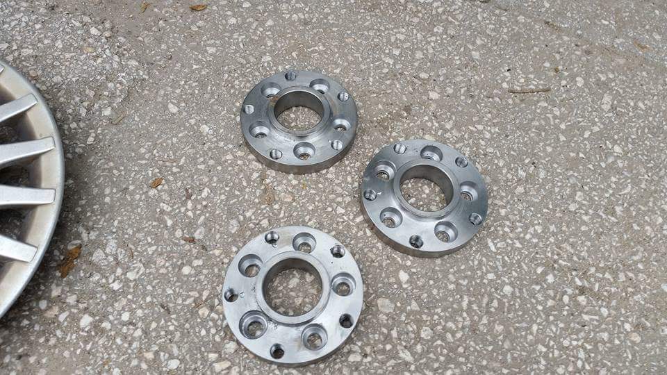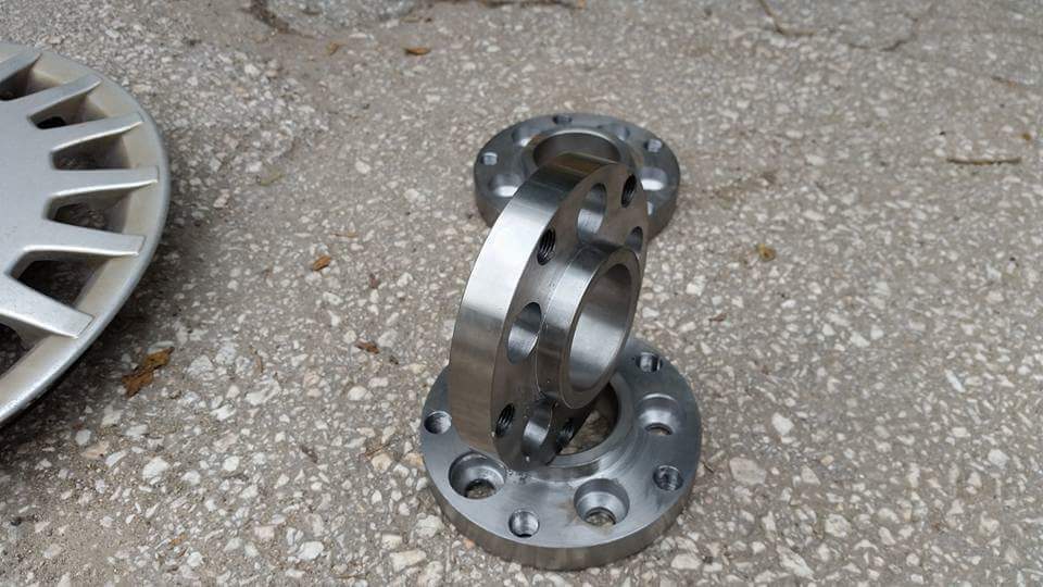 На следващата седмица след окачването бяха готови и фланците. Преобразователни от 5х100 към 5х120, предни 26мм, задни 20мм