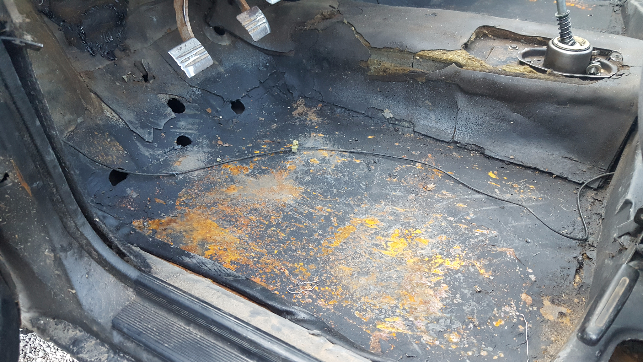 Междувременно бях изкормил интериора, понеже ходих на оглед при тенекеджия, и можете да видите състоянието на легенчетата в краката на шофьора и пасажера - изкърпени, но тръгнали пак.