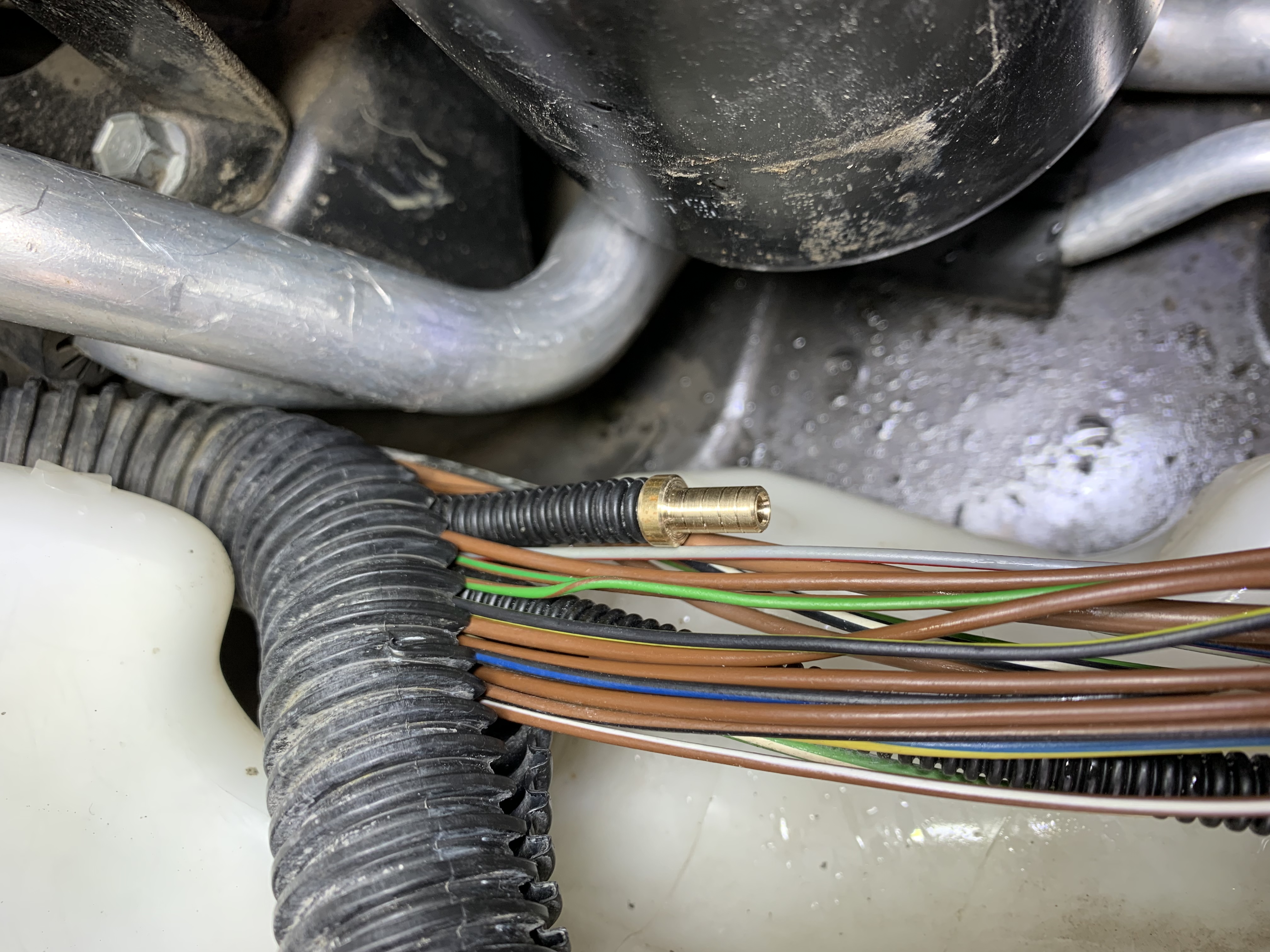 Според мен е дефект в самия маркуч, защото няма как да се притисне там (в гофре, заедно с другия маркуч и сноп кабели), а и се вижда как е раздуло отвътре навън.