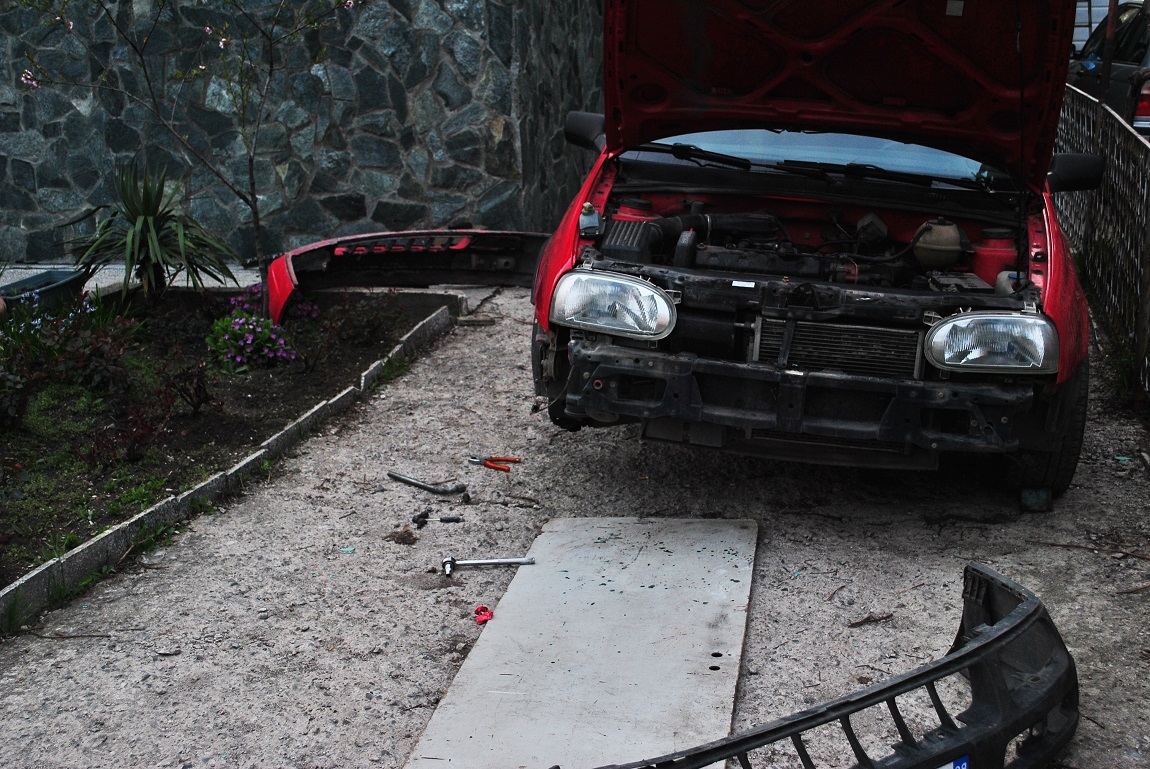 Ето една снимка от момента в който разколачих половината предница, за да сменя бронята, ПЛЮС да се опитам да си закрепя скоростния лост, защото, както казах преди нещо той се предаде. Бронята е вече на мястото си, а скоростите работят, но ме притеснява отново да не си отидат. Причината беше, че втулката, която оплътнява лоста от купето към кутията беше паднала и самия лост излязъл навън и има луфт и не позволяваше на скоростите да влизат правилно. За момента намерих втулка за 4 лева. Сложих я, върнах лоста на мястото му в дупката и няма луфт и за сега всичко е нормално... ЗА СЕГА .