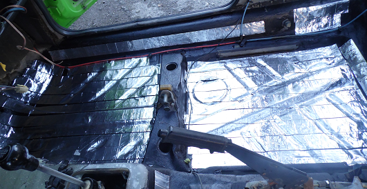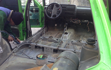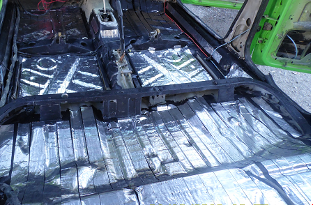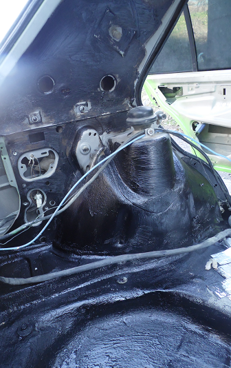 След като се привърши с почистването се премина към грундирване на пода и багажника с антикор боди 930 и непосредствен след него налепих същия с битумна лента.