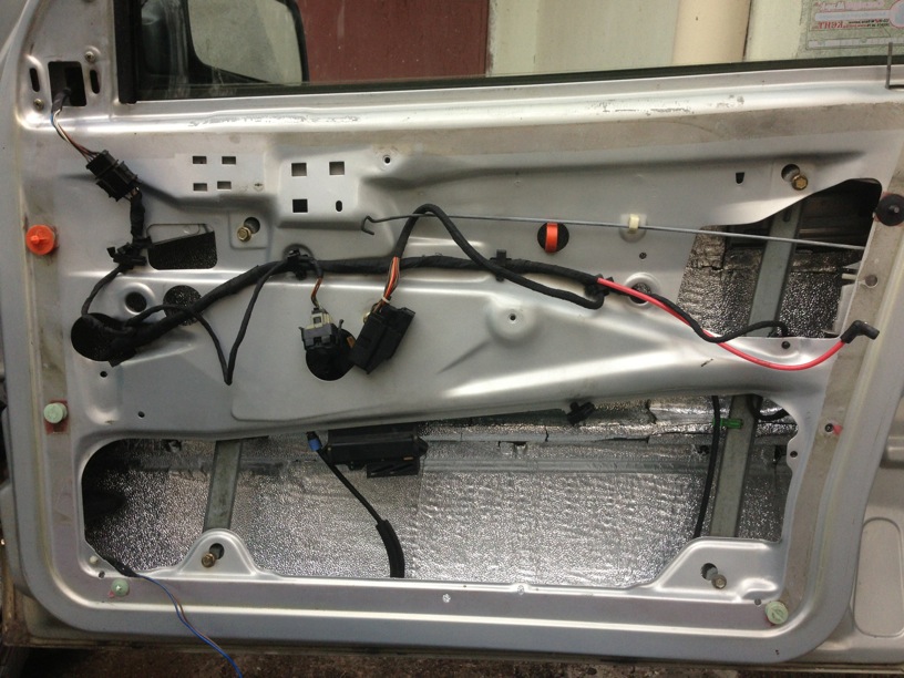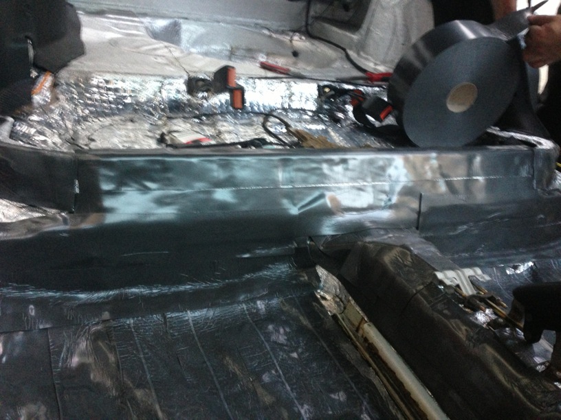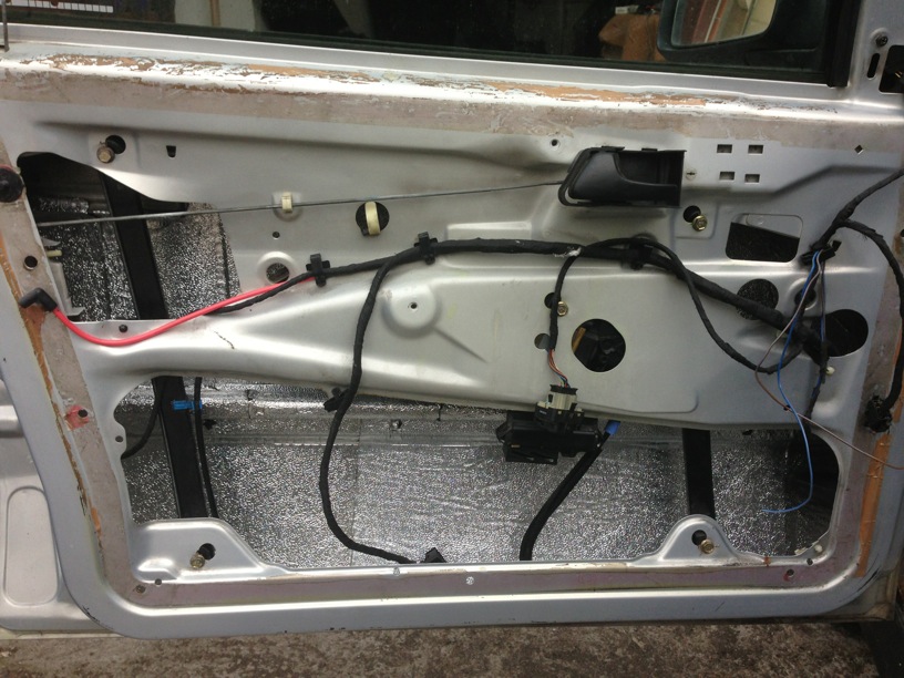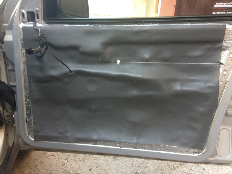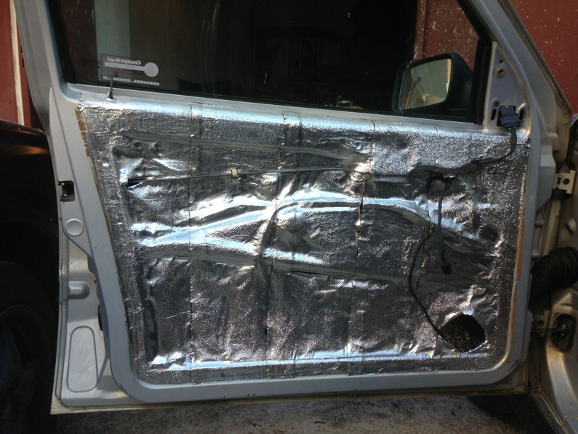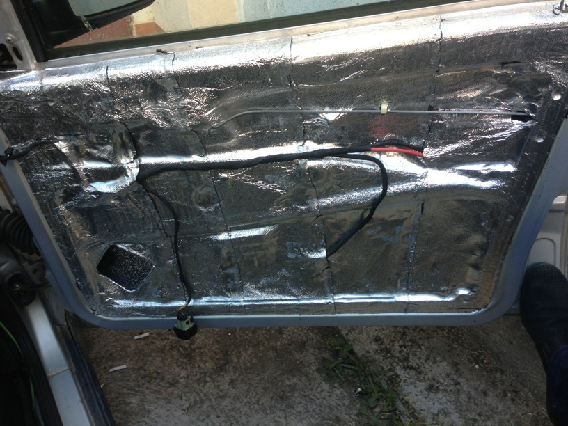 Един от най-важните моменти при шумоизолирането на автомобила са вратите. От там прониква огромно количество шум и ако не е правилно направено си е чист разход на време и материал. В този процес се постарахме да спазим всички възможни правила. Обезшумяването е трислойно, от два различни вида материали. Битумно-алуминиевия материал не е професионален и с малко под половин милиметър по-тънък от професионалните материали. Компенсирали сме със застъпване на материала при полагането му: