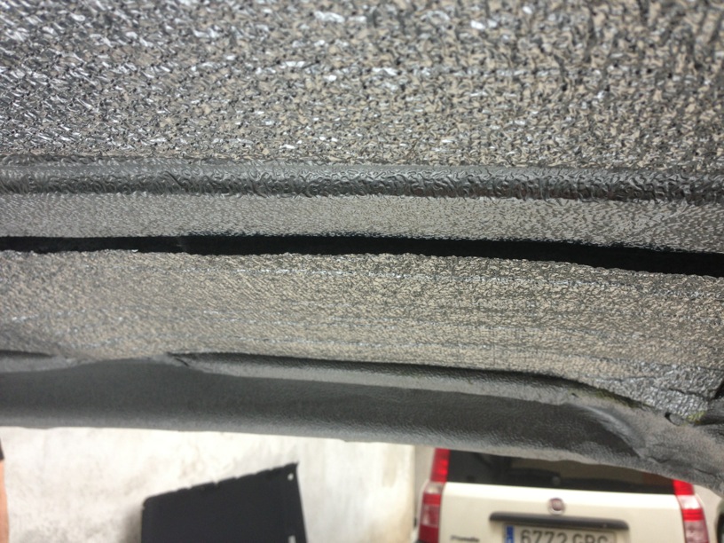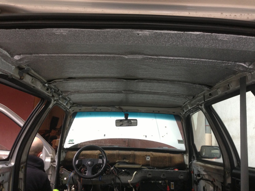 Таванът е едно от най-чувствителните места при шумоизолирането. Първо от там прониква много шум. Освен това от там прониква и много студ или жега според сезона. Шумоузолационният материал има и термозиолационни свойства. И тук се презастраховахме - застъпващи се битумно-алуминиеви панели и онзи материал на СТП, който одрах от стария голф като финиш. Крайният ефект е ... един път, да речем.